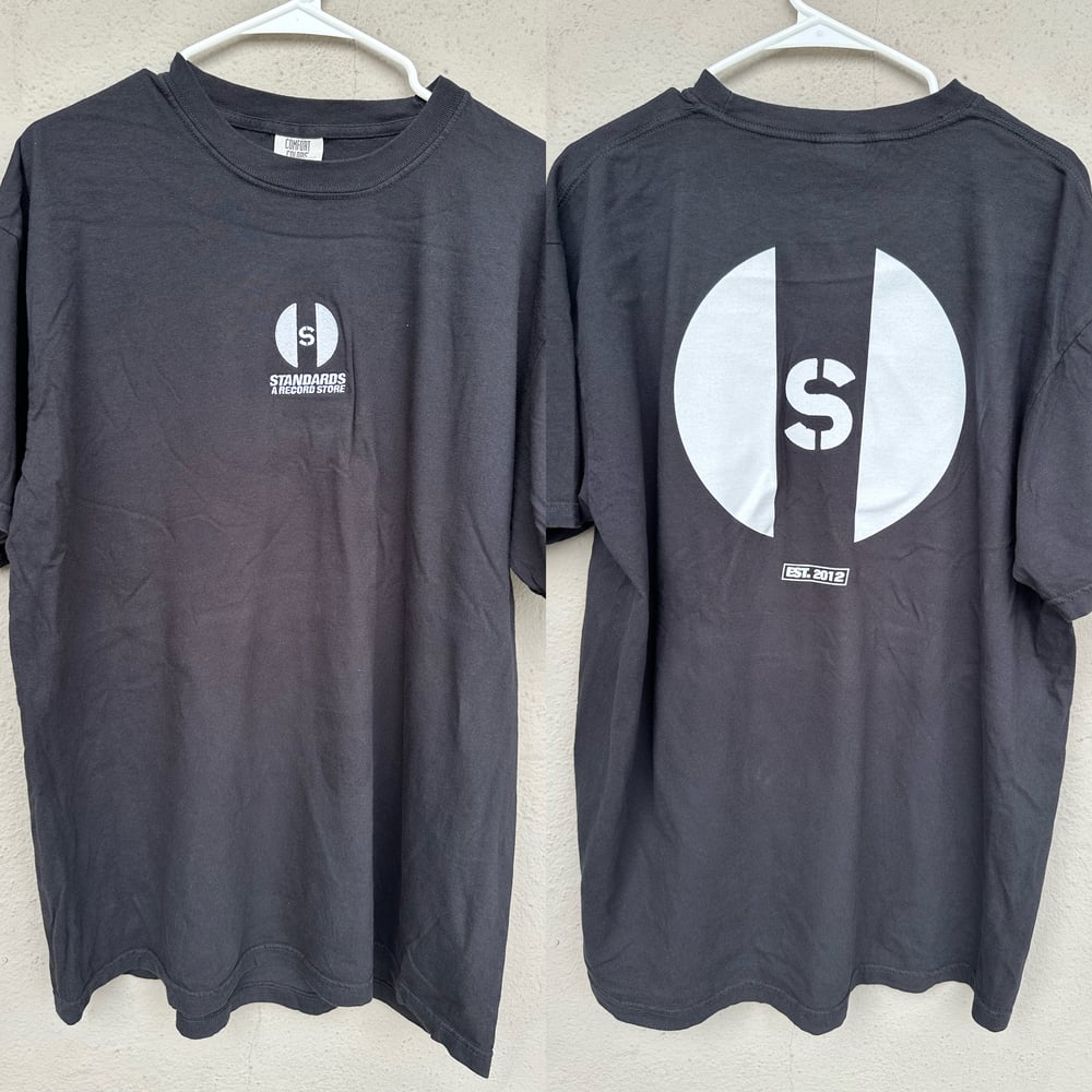 Black Comfort Colors shirt with tiny white embroidery on front and a big honkin logo screen printed on the back